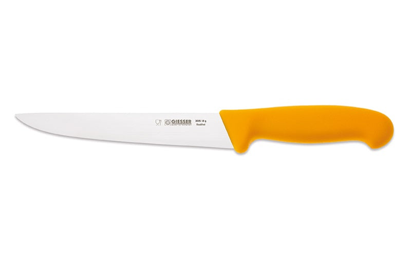 Giesser Stechmesser 18cm, gerade 3005-18ggelber KunststoffgriffProduktinformationen• Klinge aus hochwertigem Chrom-Molybdän-Stahl• Klassische Form mit geradem Rücken• Starke Klinge• Ergonomischer und rutschsicherer Kunststoffgriff• Klingenlänge: 18cm• Gesamtlänge: 32cm
