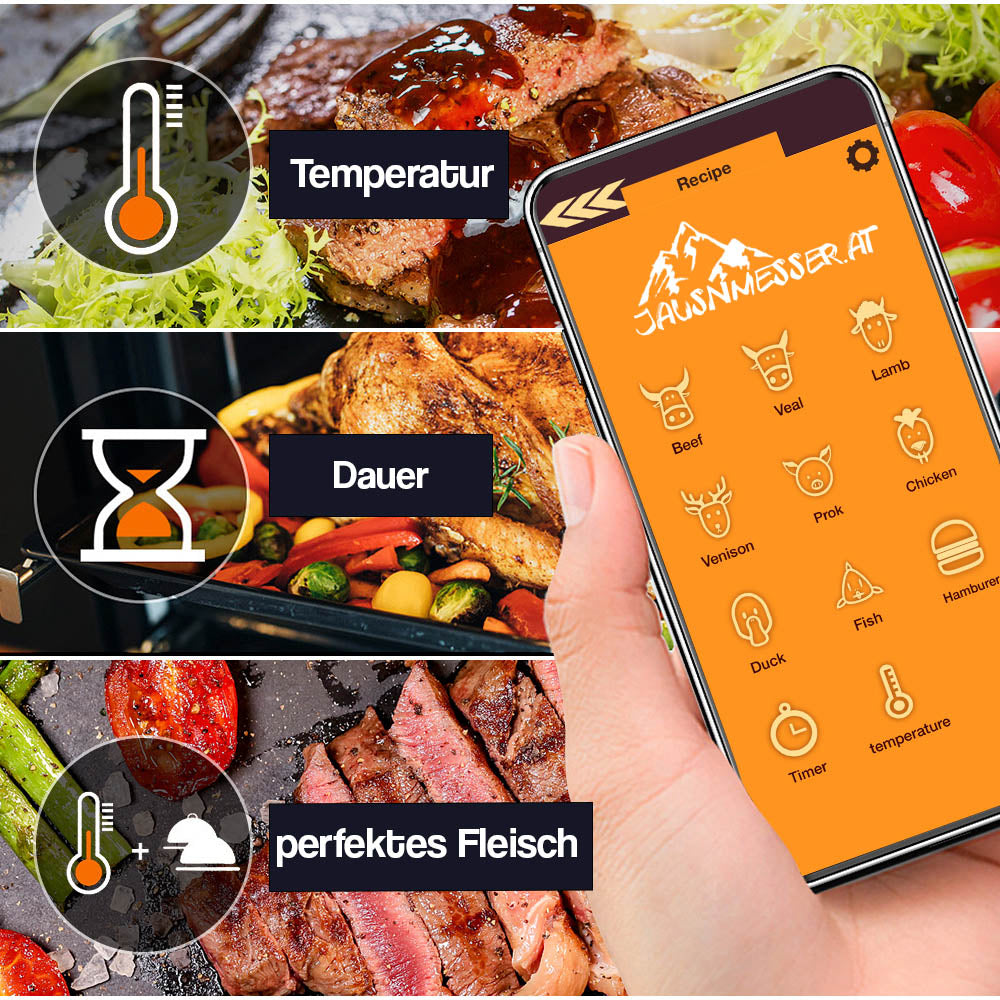 - Ob Braten, Steak oder Fisch - Immer das optimale Garergebnis. Mit dem Jausnmesser Grill- und Bratenthermometer wird Ihr Gericht immer zum Genuss. Verfolgen Sie die Temperatur bequem mit der „Grill ProbeE“ App, welche im App Store (für IOS) oder Google Play Store (für Android) erhältlich ist. So können Sie die Zeit mit Familie und Freunden genießen, ohne ständig am Grill oder Backofen zu stehen. Sobald Ihr Gargut die voreingestellte Temperatur erreich hat, werden Sie mit einem Alarm darüber informiert.